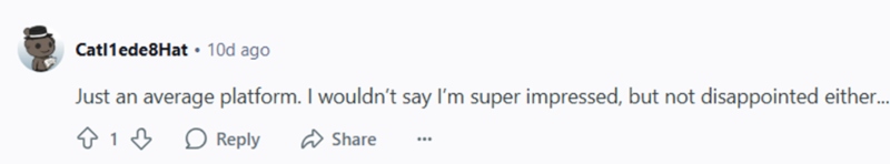 u/CatI1ede8Hat, a user from Reddit, described Winshark online casino platform as average, noting he is not overly impressed but still satisfied with the experience. Their balanced feedback suggests a reliable, if unremarkable, platform that gets the job done without major issues.